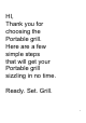 HI, Thank you for choosing the Portable grill. Here are a few simple steps that will get your Portable grill sizzling in no time. Ready. Set. Grill.