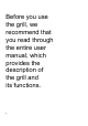 Before you use the grill, we recommend that you read through the entire user manual, which provides the description of the grill and its functions.
