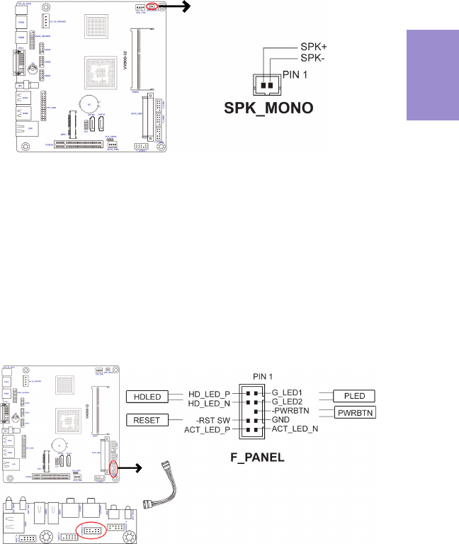 The front panel header (F_PANEL) provides a standard set of switch and LED headers