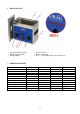 1 OPIS NAPRAVE 1 2 3 4 Pokrov iz legiranega jekla Košara iz legiranega jekla Kad iz legiranega jekla Omrežni kabel 2 TEHNIČNI PODATKI Lastnosti Dolžina (mm) Širina (mm) Višina (mm) Prostornina (L) Mere kadi (mm) Mere košare Gostota zank košare (mm) Obratovalna napetost Zaščitni razred Maksimalna poraba moči Frekvenca čiščenja 5 6 7 8 Vklop / izklop Časovno stikalo Stikalo temperature Novo: 3 stopenjski regulator moči ultrazvoka Emmi 20HC 260 150 220 20 230 x 120 x 80 205 x 100 x 60 6x6 230 / 50Hz I
