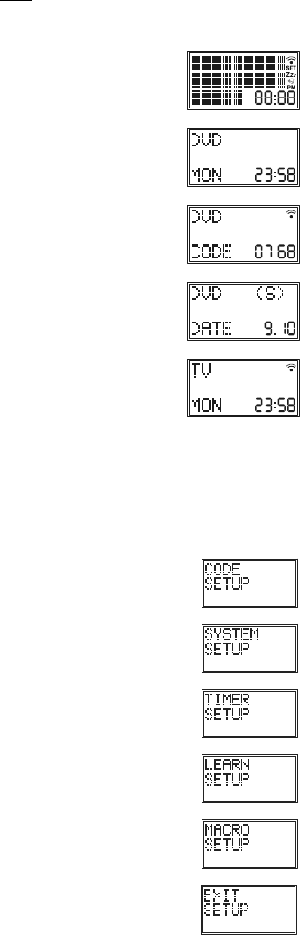 displays the active Mode of the remote e.g. DVD, the date e.g. 9:10 (Day:Month)