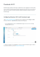 Social Login Social login allows you to use your Facebook account to access WiFi. Follow the below steps to configure social login. 1. Click Configure > SSID > Select a SSID 2. Click Captive portal > go to Authentication Type > select Social login.