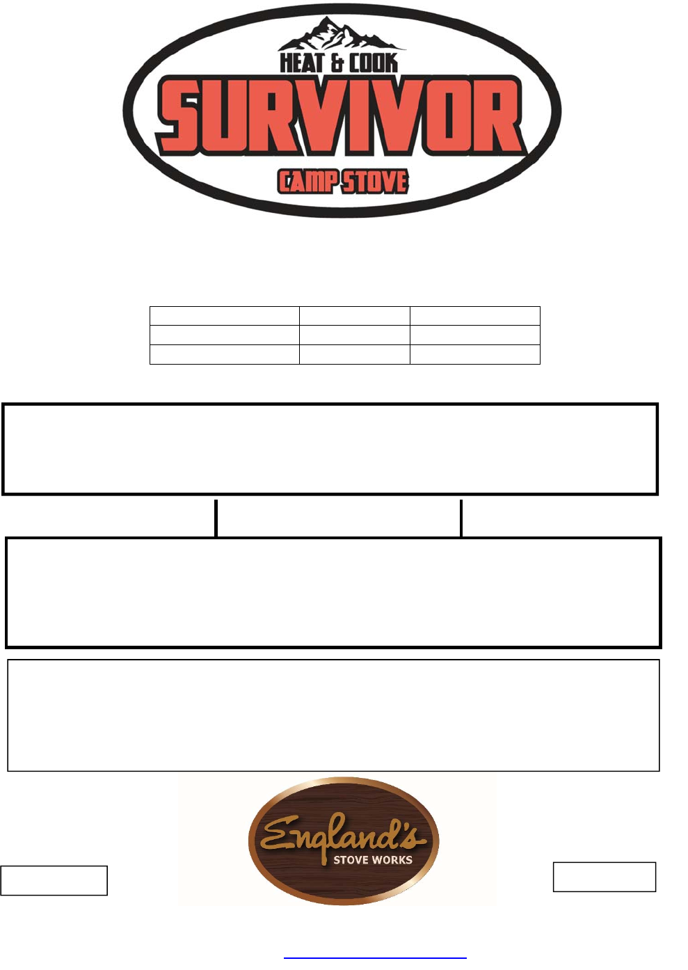 Important Notice This registration information MUST be on file for this warranty to be valid. Please mail this information, along with a copy of the sales receipt, within thirty (30) days from the original date of purchase. Use any of these three easy ways to send your warranty information in! Mailing Address England’s Stove Works, Inc. Technical Support Department P.O. Box 206 Monroe, Virginia 24574 Fax Number (434) 929‐4810 – Twenty‐four hours a day.