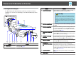 Namen van Onderdelen en Functies 9 Naam Voorzijde/Bovenzijde B Luchtafvoerventiel De afbeelding betreft EB-W10/X10. Vanaf hier worden alle functies verklaard aan de hand van afbeeldingen van EB-W10/X10,tenzij anders vermeld. Functie Afvoerventilator voor lucht die is gebruikt voor het afkoelen van het binnenste van de projector. Let op Plaats geen voorwerpen die krom kunnen trekken of op een andere manier door warmte kunnen ver‐ vormen, in de buurt van het luchtafvoerventiel.