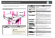 Namen van onderdelen en functies Naam Onderkant Naam 13 Functie A Bevestigingspunten ophangbeugel (drie punten) Bevestig de optionele ophangbeugel hier als u de projector aan het plafond wilt ophangen. s "De projector installeren" pag.21 s "Optionele Accessoires" pag.103 B Voeten aan achterzijde Als de projector op een plat oppervlak is geplaatst, bv. op een desk, kunt u deze voeten uitschuiven of intrekken om de horizontale beeldhoek aan te passen. s "De horizontale helling bijstellen" pag.