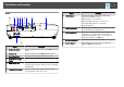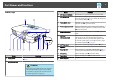 Part Names and Functions 7 Name Rear Name Function A Remote Receiver Receives signals from the remote control.s Quick Start Guide B Power inlet Connects to the power cable.s Quick Start Guide C Video Input Port For composite video signals from video sources. D Lamp Cover Fixing Screw Screw to fix the Lamp cover in place.s p.56 E HDMI input port Inputs video signals from HDMI compatible video equipment and computers. This projector is compatible with HDCPg.