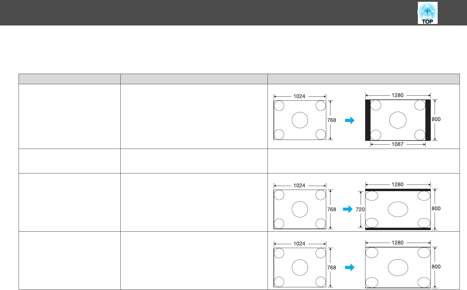 Projects to the full projection size at an Aspect of 16:9. When a 1024x768 signal is input