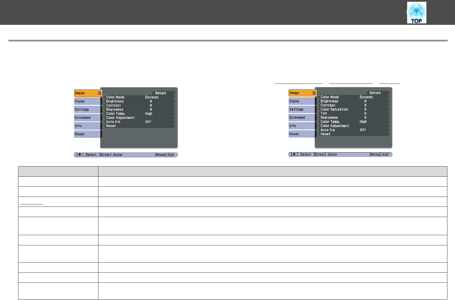 Items that can be set vary depending on the image signal and Source currently being projected as shown in the following screen shots. Setting details