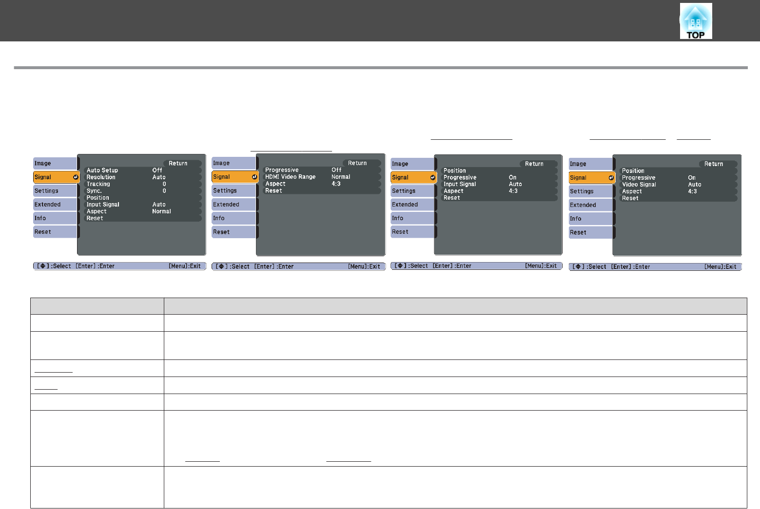 Items that can be set vary depending on the image signal currently being projected as shown in the following screen shots. Setting details are saved for