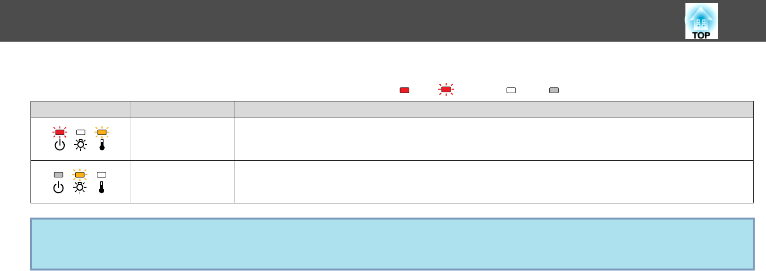 • If the error is not indicated in this table, stop using the projector, disconnect the power cable from the electrical outlet, and contact your local dealer or