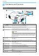 Introduction Part Names and Functions Front/Top Name Function Open when replacing the projector's lamp. s p.70 a Lamp cover b A/V mute slide knob Slide the knob to open and close the lens cover. Close during projection to delete audio and video. s p.28 c Air exhaust vent Exhaust vent for air used to cool the projector internally. Caution While projecting, do not put your face or hands near the air exhaust vent, and do not place objects that may become warped or damaged by heat near the vent.