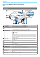 Introduction Part Names and Functions Front/Top Name a Lamp cover b A/V mute slide lever Function Open when replacing the projector's lamp. s p.92 Slide the knob to open and close the lens cover. Close during projection to delete audio and video. s p.32 c Air exhaust vent Exhaust vent for air used to cool the projector internally. Caution While projecting, do not put your face or hands near the air exhaust vent, and do not place objects that may become warped or damaged by heat near the vent.