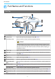 Introduction Part Names and Functions Front/Top Name a Lamp cover b Air exhaust vent Function Open when replacing the projector's lamp. s p.120 Exhaust vent for air used to cool the projector internally. Caution While projecting, do not put your face or hands near the air exhaust vent, and do not place objects that may become warped or damaged by heat near the vent. Hot air from the air exhaust vent could cause burns, warping, or accidents to occur. c Focus ring d Lens cap Adjusts the image focus.