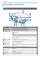 Introduction Part Names and Functions Front/Top Name Function a Lamp cover b Lens shift dial Open when replacing the projector's lamp. s p.93 c Air exhaust vent Exhaust vent for air used to cool the projector internally. Adjusts the position of the projected image. s p.28 Caution While projecting, do not put your face or hands near the air exhaust vent, and do not place objects that may become warped or damaged by heat near the vent.