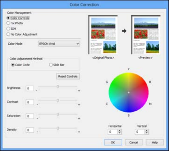 Lets you select a Color Mode setting, individual settings for Brightness, Contrast, Saturation, and