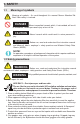 1. SAFETY 1.1 Meaning of symbols ! Meaning of symbols - As used throughout this manual: Means Attention! Be Alert! Your safety is involved. DANGER Means immediate hazards which, if not avoided, will result in immediate, serious personal injury or loss of life. ! CAUTION Means hazards which could result in minor personal in- jury. ! WARNING Before use, read and understand the instruction manual and follow all labels, employer´s safety practices and Material Safety Data Sheets (MSDS).