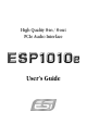 ESI ESP1010e 1. Introduction Thank you for choosing the ESI ESP1010e, the perfect audio gear for multi channel recording applications in your home studio and for home entertainment. The hardware integrates the latest interface standard for extremely fast and reliable data transfer, more reliable and stable than comparable FireWire or USB 2.0 interface solutions. ESP1010e is equipped with 24-bit converters on up to 8 analog inputs, up to 8 analog outputs.