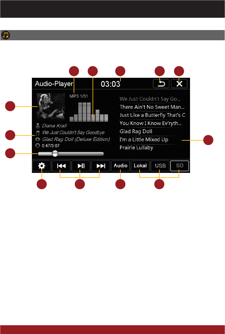 Hauptmenü oder durch das Drücken der Taste „MUSIC“ am Gerät. Der Audio-Player unterstützt die