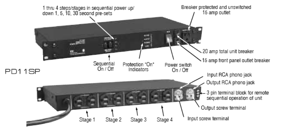 The PD11SP is a sequential four step/stage power up/down conditioned power distribution unit. It