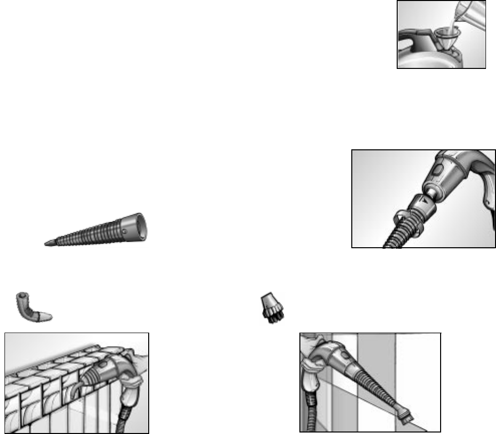 5. The round brush and curved nozzle can be fitted to the straight nozzle or the spray