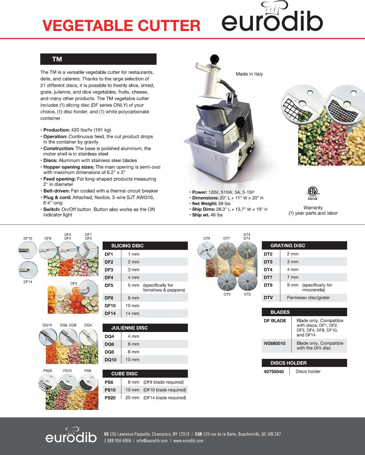 The TM is a versatile stabilize cutter for restaurants, Wilda it aly delis, and caterers. Thanks to the large selection of 21 different discs, it is poss ibis to freshly slice, shred, grate, julienne, and dice vegetables, fruits, chess, and many other products. The TM vegetable cutler includes (1) slicing disc {DF dazzler ONLY) of your choice, {1} disc hider, and {1} white poly carbonates container.