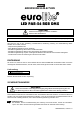 TECHNICAL SPECIFICATIONS Power supply: Power consumption: Number of channels: DMX-512 connection: Sound-control: Maximum ambient temperature Ta: Maximum housing temperature TB: Min. distance from flammable surfaces: Min. distance to lighted object: Type of LEDs: Number of LEDs: Beam angle: Fuse: Dimensions (LxWxH): Weight: 230 V AC, 50 Hz ~ 23 W 5 3-pin XLR via built-in microphone 45° C 50° C 0.5 m 0.1 m 5 mm 151 21° F 0.5 A, 250V 165 x 205 x 240 mm 1.