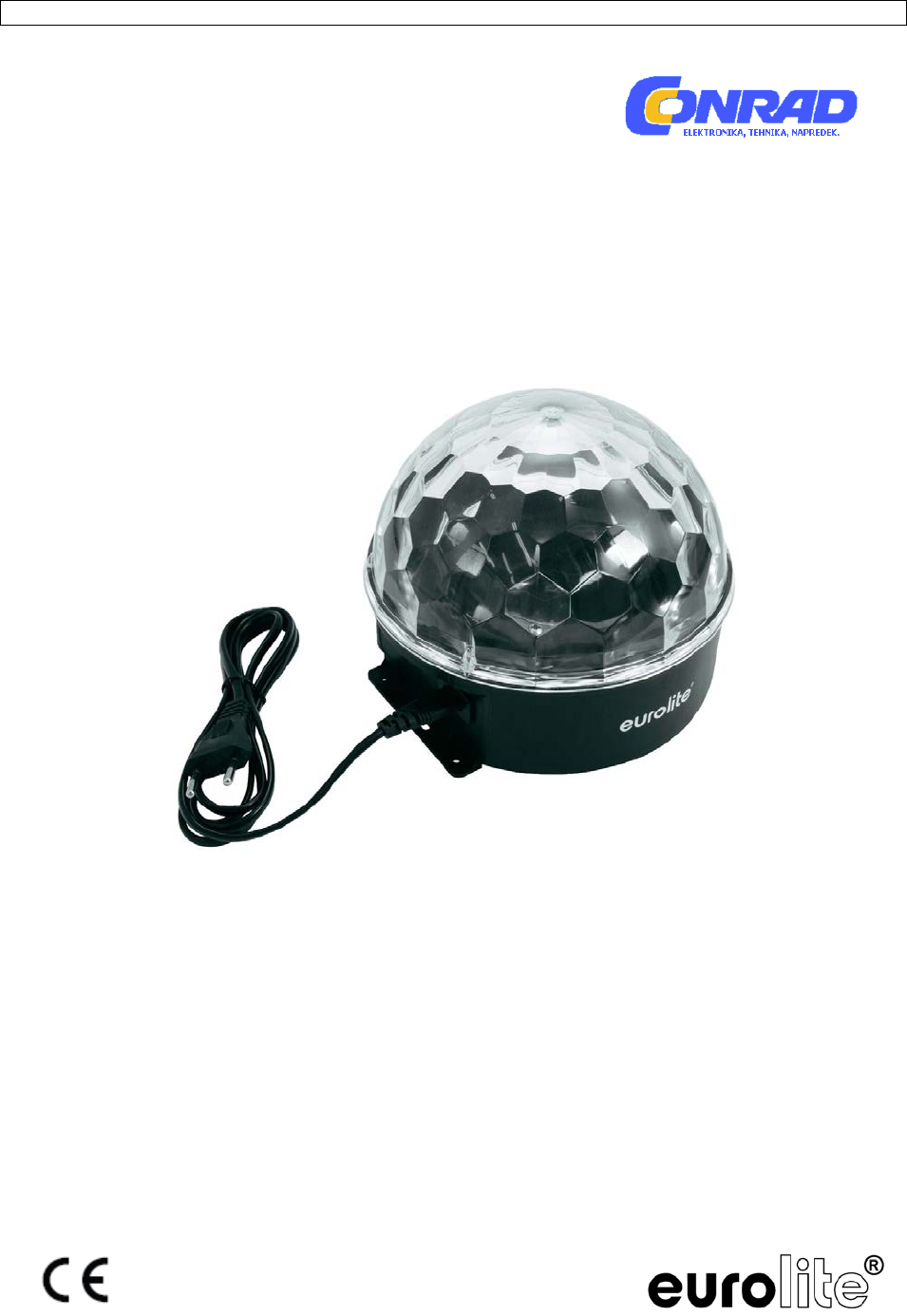 OPIS NAPRAVE Značilnosti Navdušujoči učinki zrcalne krogle • Prozorna, fasetirana površina poskrbi za edinstvene učinke žarkov • Opremljen s tremi 1 W LED • Pribl. 30 obratov na minuto (za 180°) ustvarja igro svetlobe v obliki krogov • Možnost viseče ali stoječe namestitve • Pripravljen na priključitev prek električnega kabla z evropskim vtičem •.Tehnologija stikalnega napajalnika omogoča samodejno prilagoditev omrežne napetosti ..