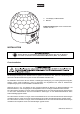 If this device will be operated in any way different to the one described in this manual, the product may suffer damages and the guarantee becomes void. Operation: - With the ON/OFF-switch on the housing bottom, you can switch the devices on and off. - The plastic cap serves as effect-ON/OFF-switch. One gentle press and the double reflector begins to rotate around the LED, the central light source Disposing of the battery Please refer to the explanations under Operating Determinations.