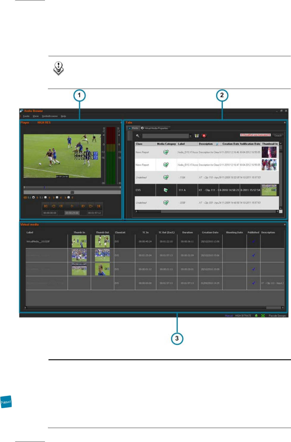 The Xedio Browse graphical interface consists of three main areas, besides the