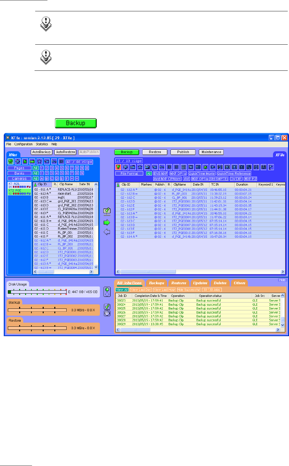 In Backup mode, the XNet tab shows the clips available on the XNet depending on the