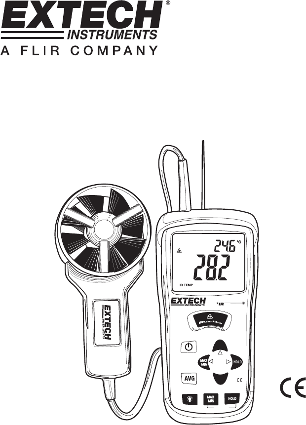 Introduction Nous vous félicitons pour votre achat du Thermo-anémomètre CFM/CMM avec Thermomètre Infrarouge Extech AN200. Cet instrument mesure la Vitesse de l’air, l’Écoulement d’air (volume), la Température d’air (avec sonde) et la Température d’une surface (avec la fonction infrarouge). L’écran à cristaux liquides, grand et facile à lire, comprend un affichage principal et un affichage secondaire, ainsi que plusieurs indicateurs d’état.