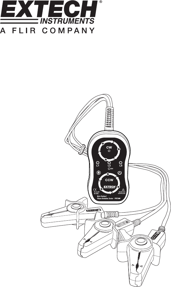 Introducción Agradecemos su compra de este medidor Extech. El PRT200 se utiliza de forma rápida y precisa para determinar la secuencia trifásica para la instalación y reparación del motor. La técnica de detección de tensión sin contacto facilita la conexión a conductores aislados, evitando conexiones inciertas y difíciles de cables de alta tensión al descubierto. Este medidor se embarca probado y calibrado y con uso adecuado le proveerá muchos años de servicio confiable.