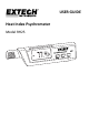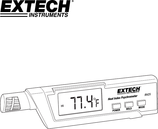 Introduction Thank you for selecting the Extech Instruments Model RH25 Heat Index Psychrometer. The RH25 measures Temperature and Relative Humidity (using precision capacitance RH sensor). The RH25 also calculates and displays Heat Index, Dew Point, Wet Bulb, and Wet Bulb Globe temperatures. The High Temperature Alarm feature alerts the user when Heat Index or Wet Bulb Globe levels exceed user‐preset limits. Data Hold and MIN/MAX/AVG memory utilities make it easier to recall important data.