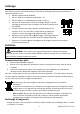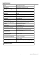Spécifications Écran Écran LCD rétro-éclairé Microphone Condensateur Electret de 0,5 po Affichage de surcharge d’entrée « ---- » Gamme de mesures 35 à 130 dB Résolution 0,1 dB Pondération fréquentielle « A » et « C » (au choix) Précision/Résolution ± 1,0 dB @ 1kHz /0,1 dB Fréquence 31,5 à 8 000 Hz Temps de réponse Rapide : 125 millisecondes / Lente : 1 seconde Source de calibrage requise Onde sinusoïdale de 1 KHz à 94 dB Trépied Situé au dos de l’appareil Alimentation 3 x piles AAA de