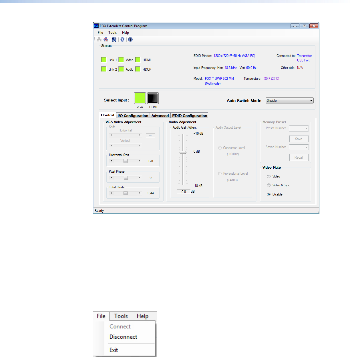 The File menu contains options for connecting and disconnecting the device and exiting the
