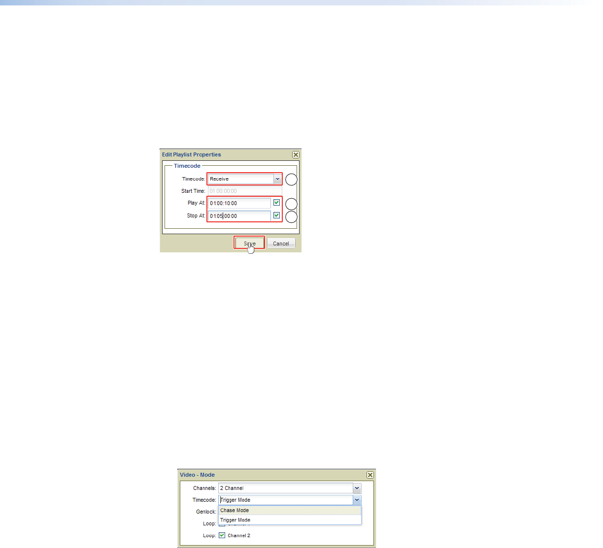 • Trigger Mode — The media player begins playback at a specific LTC timestamp value,
