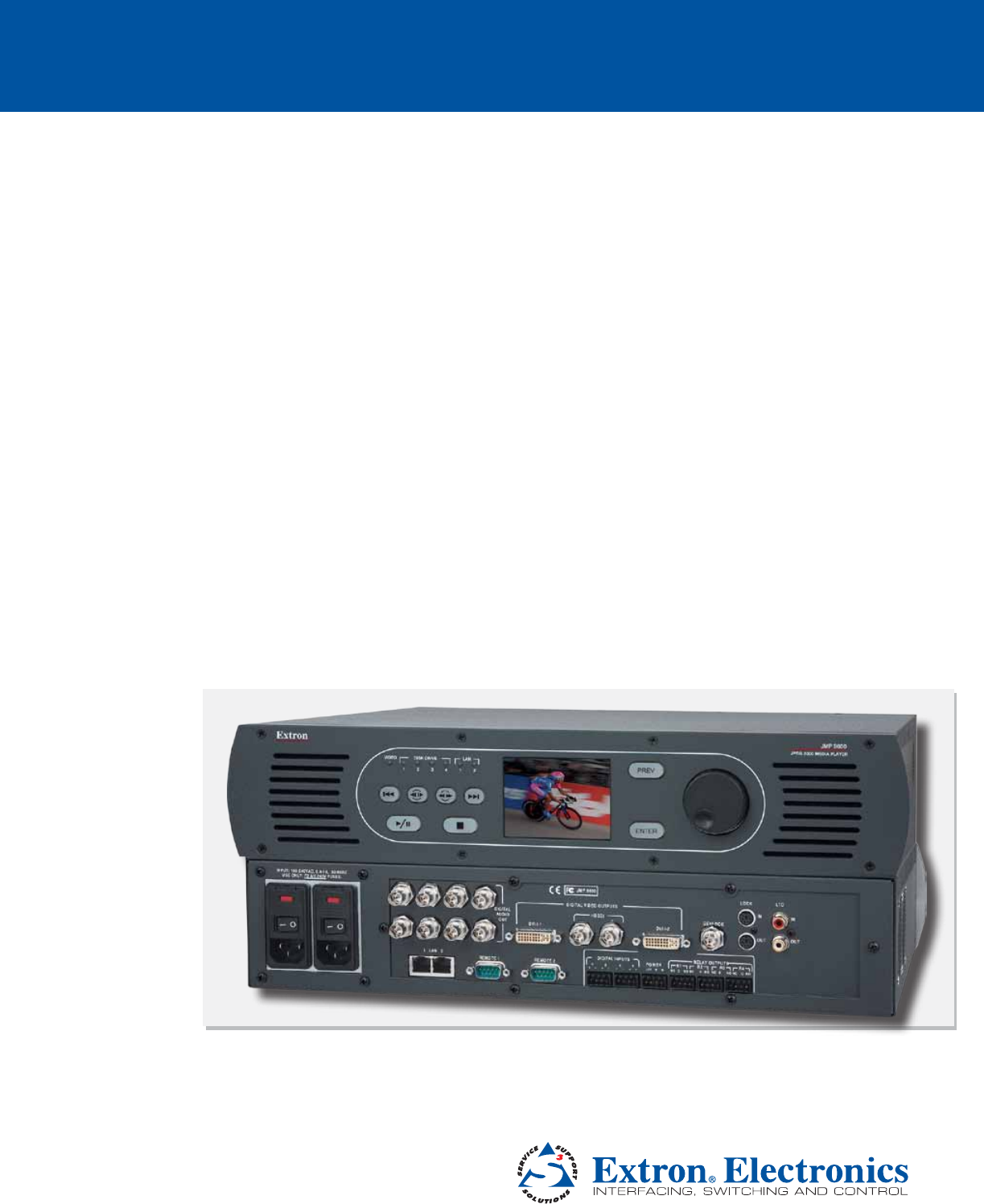 Extron JMP 9600 2K HD Video Player Show Control System Ethernet Switch Linear Time Code C LT S UT TP 96 P OU EO I 2 L VIDSD TA HD GI DI 1 DV I-I-2 OU N LA L TA DIGI DIO AU T 7-8 OU N LA N LA N DV S UT 4 L INP3 - + + I-I-1 + LA TE 5-6 N TP R3 HZ /60 , 50 S. -1A SE 0.