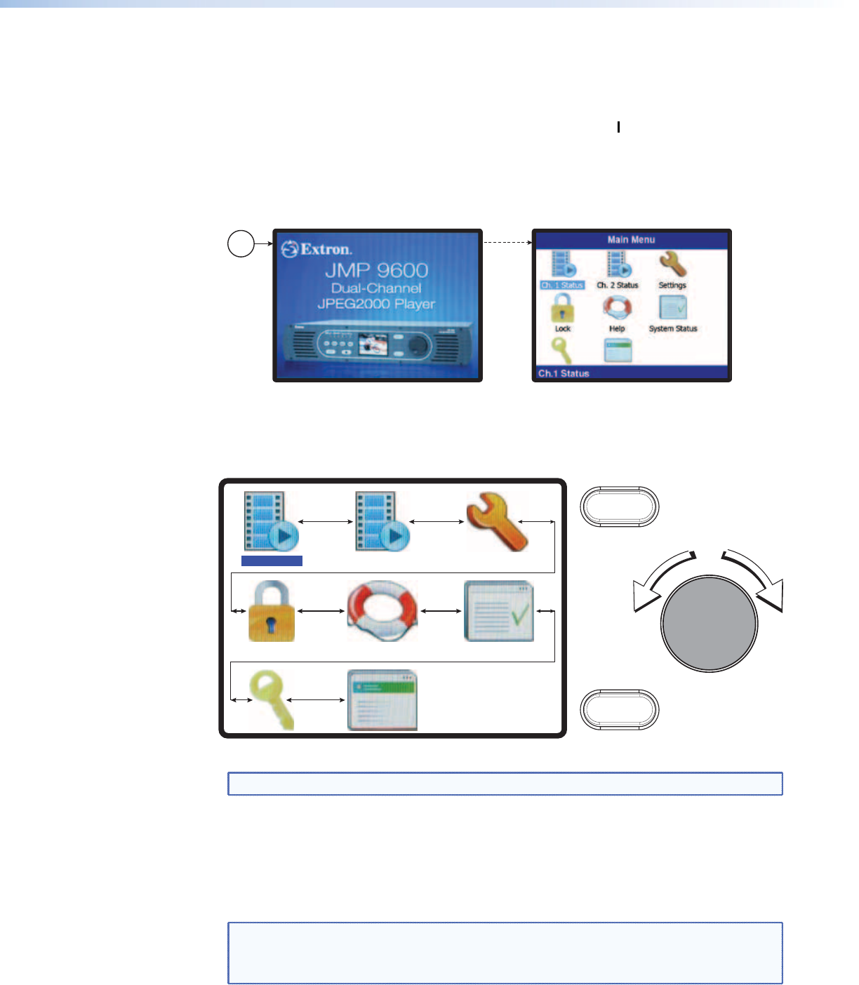 Encoder knob — Rotate the encoder knob to navigate through the main menu and