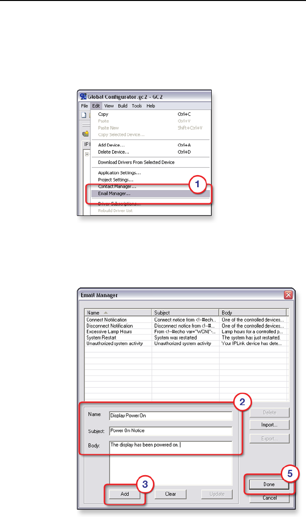 The Email Manager dialog box is used to create custom e-mails