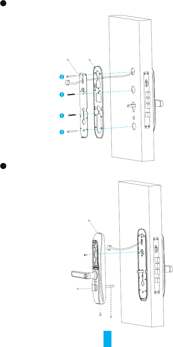 Instale a placa xa e a base de borracha na porta com ① o pino de posicionamento e ② aperte a luva.