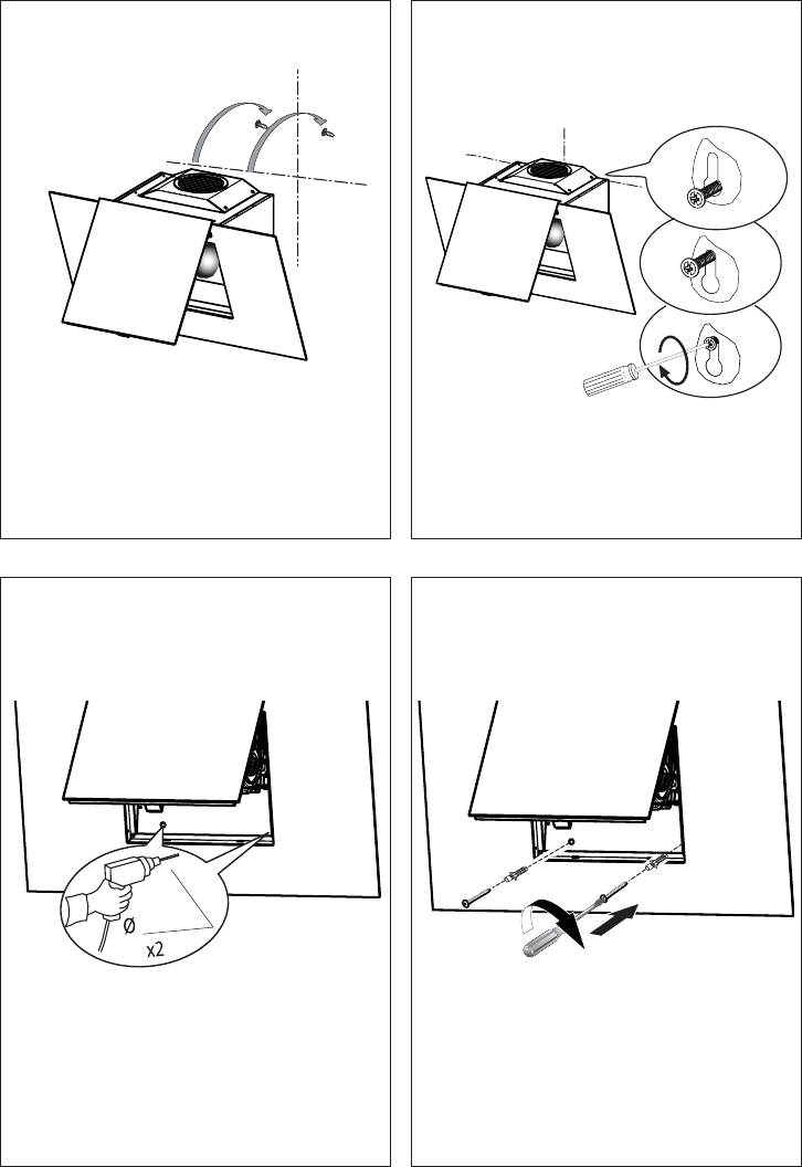 Engagez le bâti de la hotte sur les Vis a mur. Vissez à fond les deux vis.
