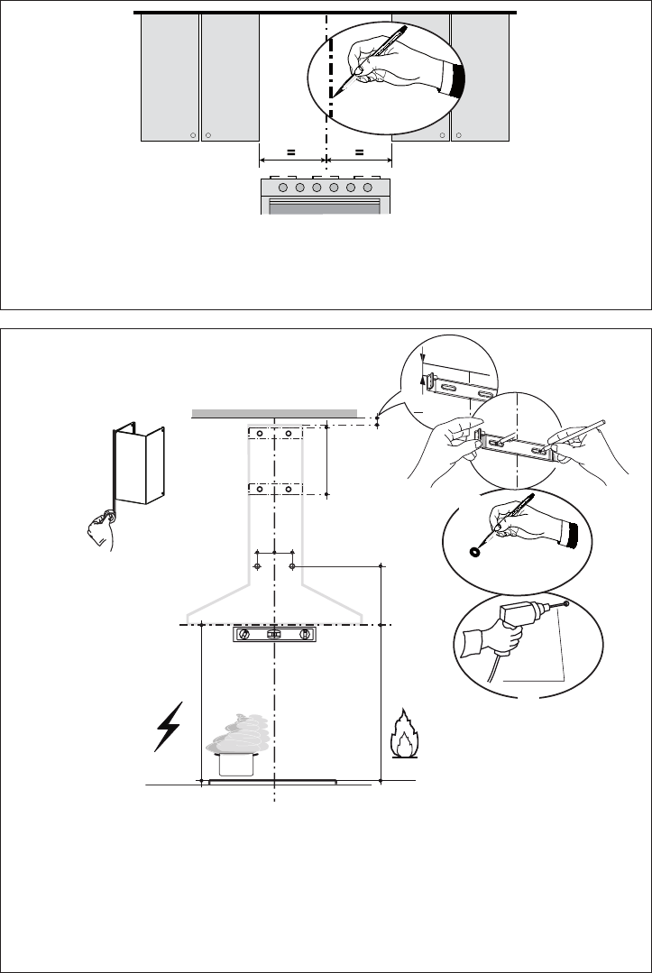 Mark the wall at the centers of the holes in the bracket and mark the point 1 and 2 for the Hood Body
