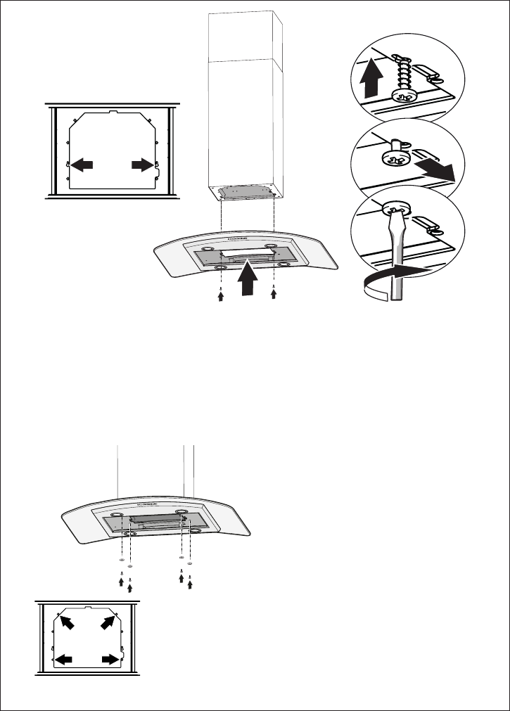 Soulevez l'auvent de la hotte et insérez les vis 12f dans les fentes, en les enfonçant le plus possible.