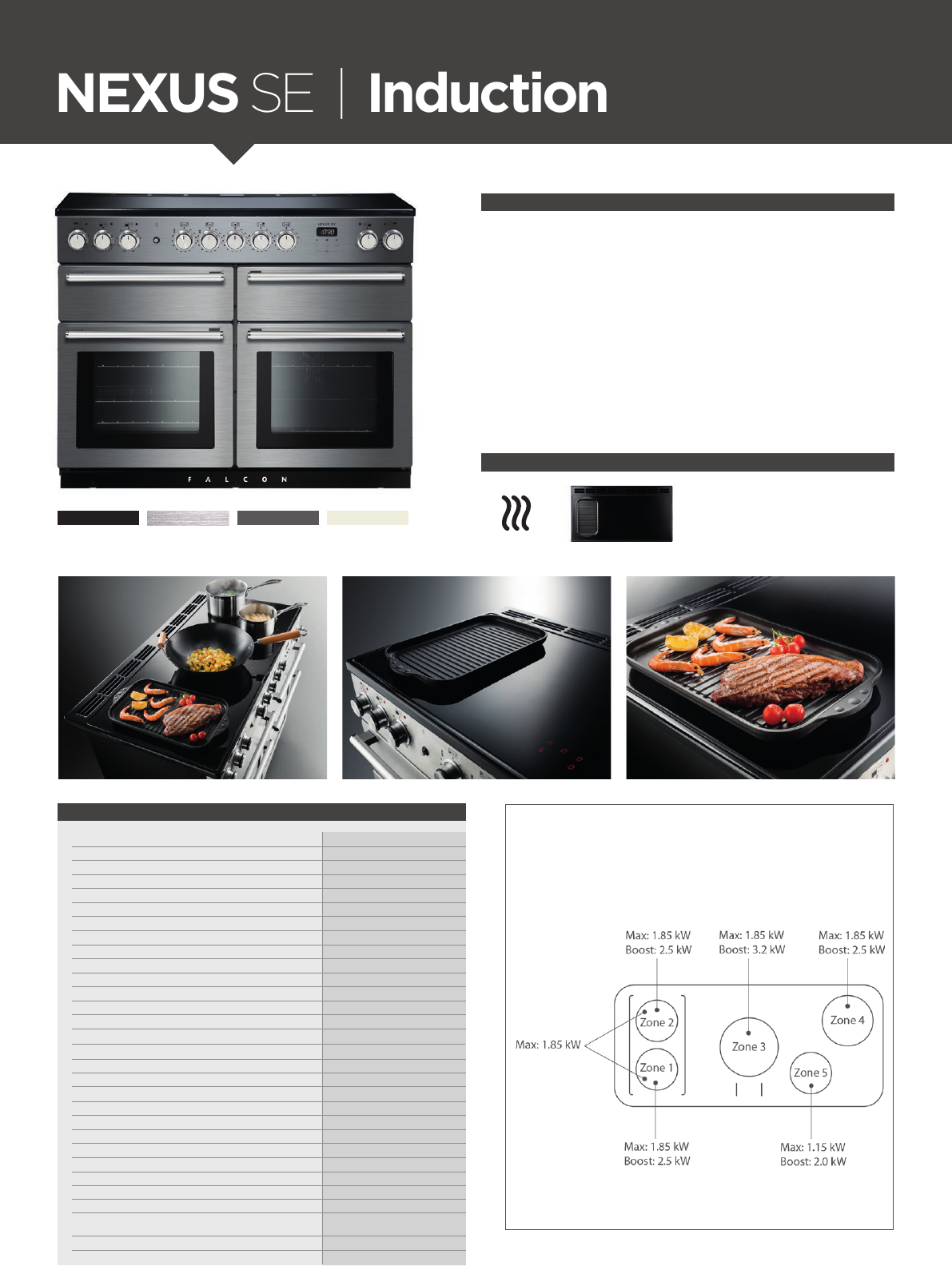 • Induction hob with 5 cooking zones, including a large central zone and a