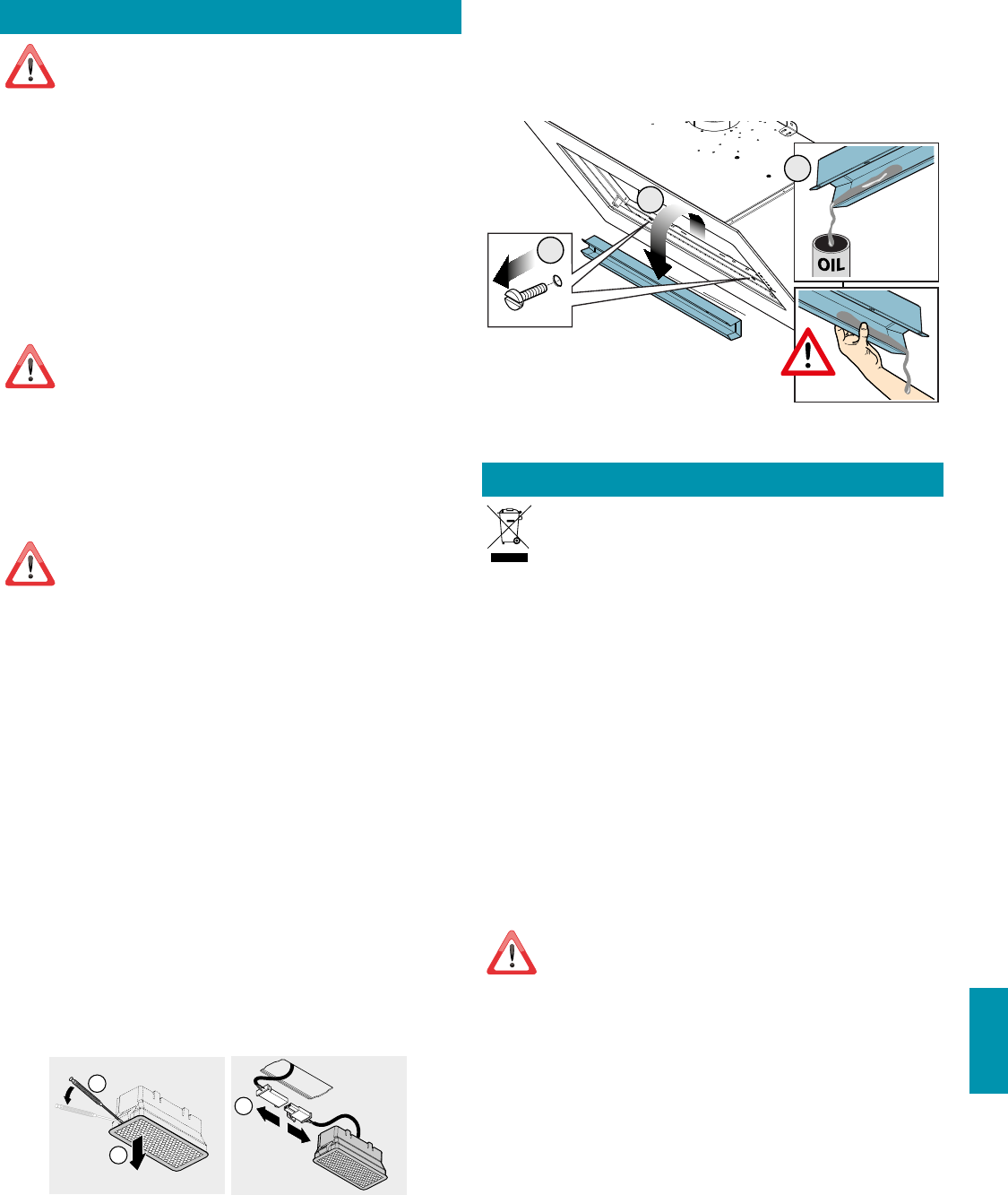 For udtagning og bisættelse af fedtfiltrene i metal, se monteringsvejledningen.