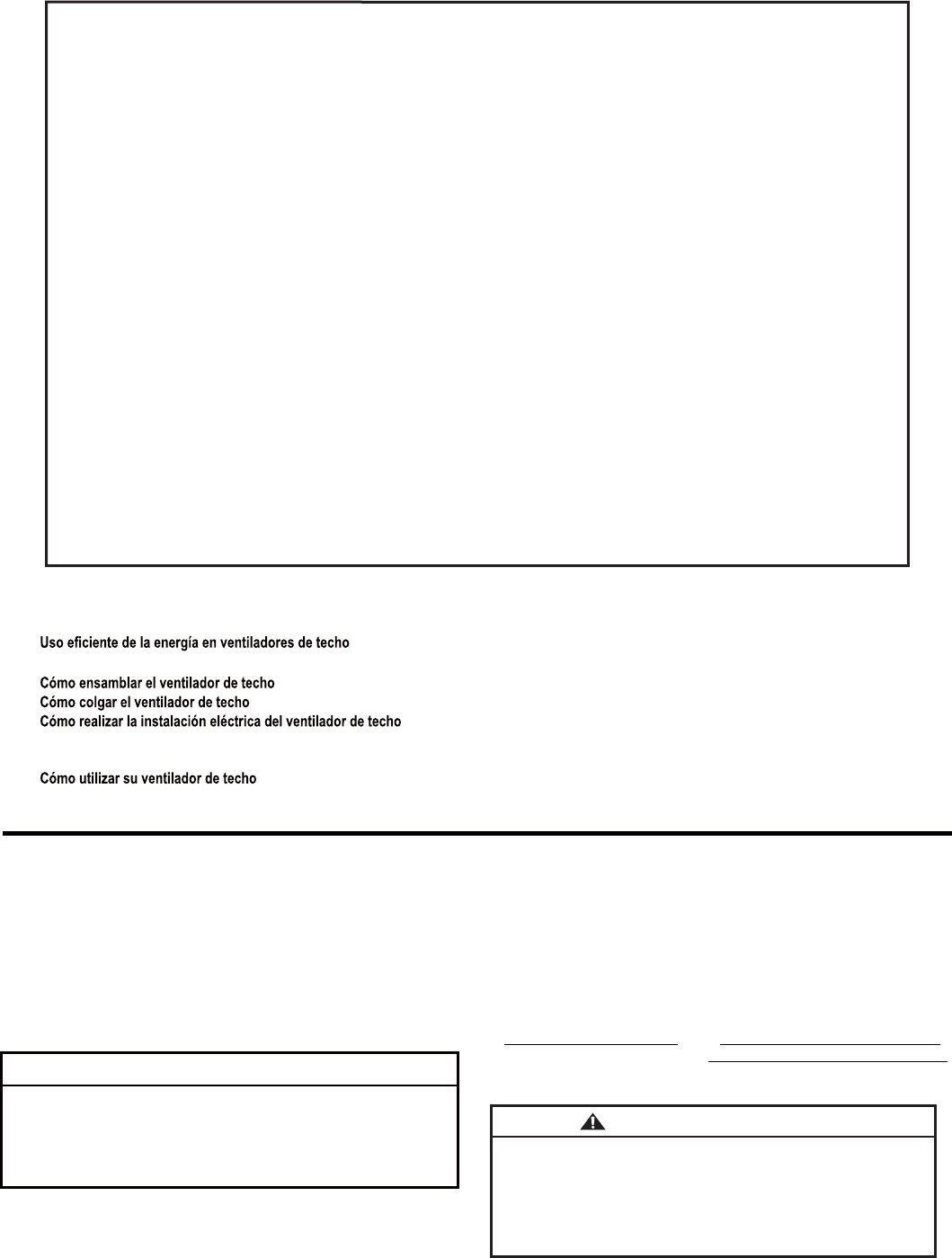 la instalación, el funcionamiento y el mantenimiento de su ventilador de techo
