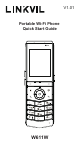 Packing list Portable Wi-Fi Phone Battery Cover Charging Base Quick Start Guide Rechargeable Battery Belt Clip Power Adapter Handset Distance sensor Earpiece Status Indicator Headphone jack Screen Volume Key + Volume Key Soft key Hands-free OK key PTT key Soft key Phone book Navigation key Off-hook key Speaker On-hook key/Power Keypad Mute key Microphone Charging interface Install the battery 1.