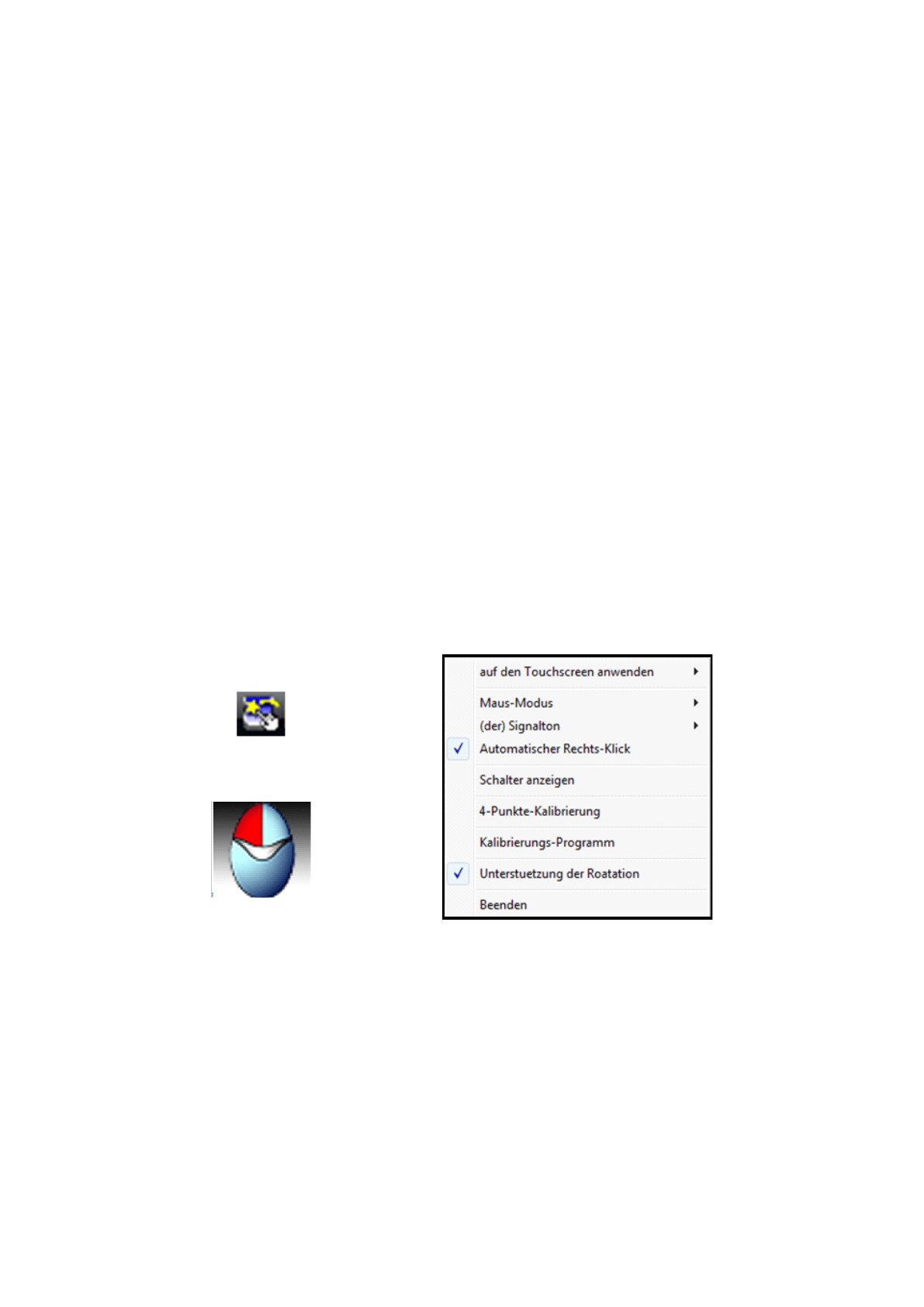 Über das TouchKit-Symbol in der Taskleiste können Sie mit dem rechten Mausklick folgende