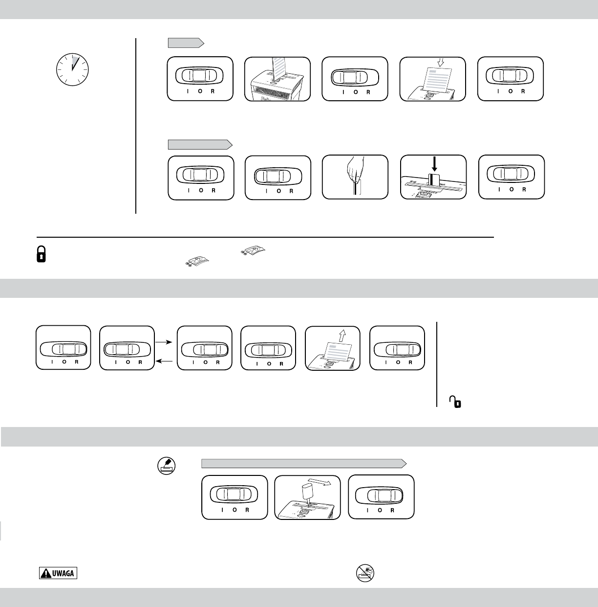 Blokada bezpieczeństwa zapobiega przypadkowemu uruchomieniu. Aby ustawić, poczekać na zatrzymanie się niszczarki, wcisnąć czarny