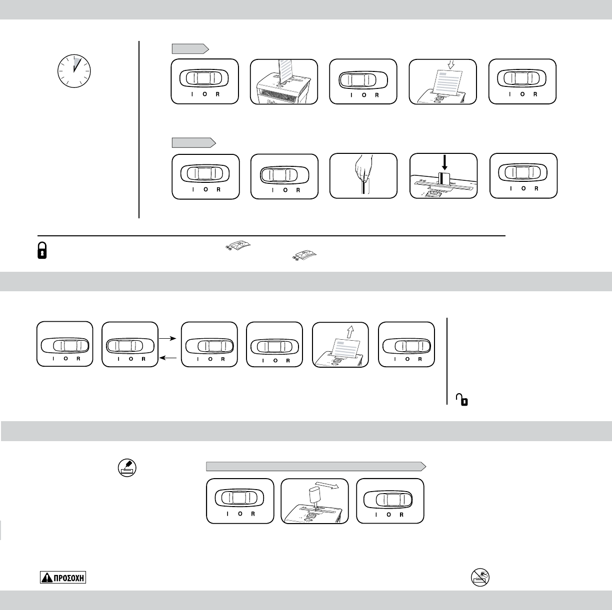 Το κλείδωμα ασφαλείας αποτρέπει την απροσδόκητη λειτουργία. Για ρύθμιση, περιμένετε έως ότου σταματήσει ο καταστροφέας εγγράφων, κατόπιν πιέστε το μαύρο